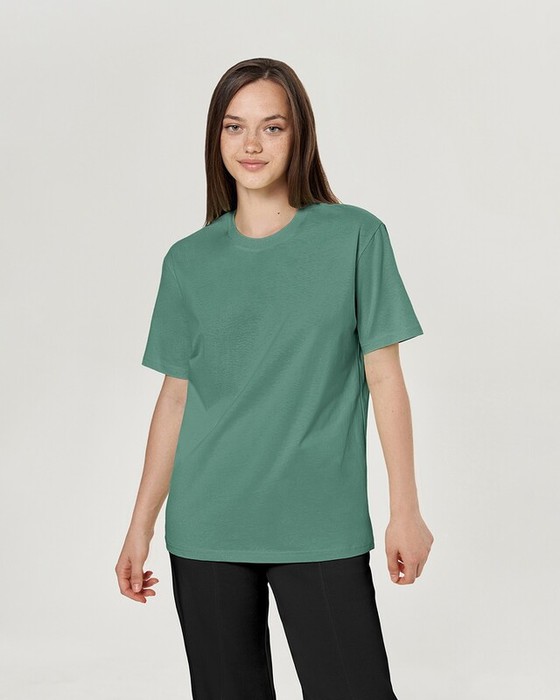 Boyfriend крой, укрепление по горловине спинки, круглый вырез. Горловина рибана. Отстрочка по горловине переда