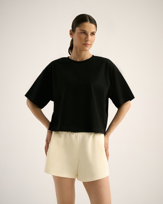Укороченная футболка CROP, спущенное плечо. горловина из рибаны. Укрепление плечевых швов и шва горловины бейкой из основной ткани.