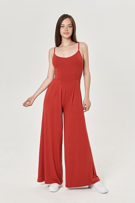 Комбинезон женский, с отрезной линией талии. Верх двойной на бретелях, прилегающий с рельефами по переду. Нижняя часть комбинезона расклешенная от линии бедер.