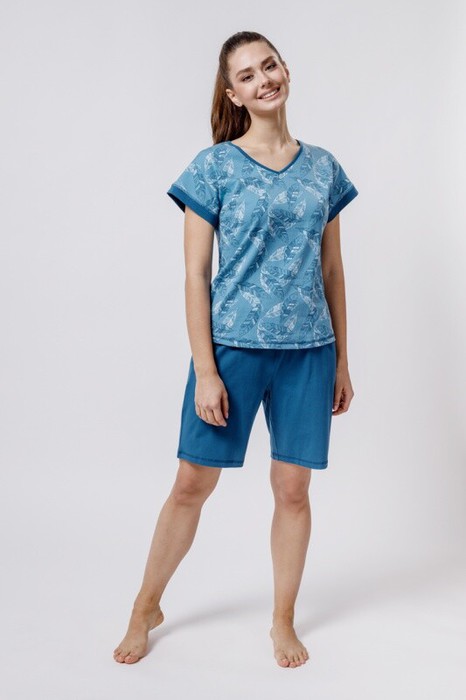 Футболка с цельнокроеным рукавом и отрезными манжетами из однотонной ткани, с горловиной V вырезом. Спинка разрезная,  декор отстрочка. Удлиненные шорты свободного кроя, отстроченный пояс.