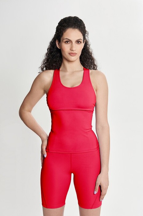 Майка спортивная с отрезной линией под грудью. Деталь лифа трохслойная с вставными чашками. Боковые фигурные рельефы по нижней части майки. Проймы, горловина и вырез спинки окантованы