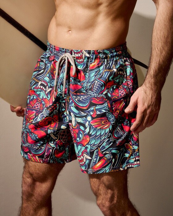 Плавательные шорты. Карманы в боковых швах. Задний карман с клапаном на правой задней половинке шорт. Пояс цельнокроенный, отстроченный, внутри с резинкой и шнурком.