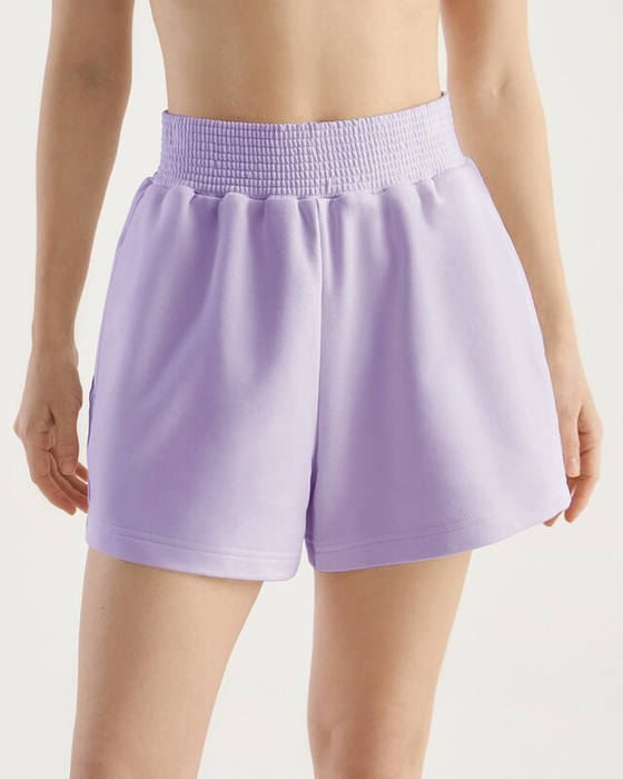 Шорты расклешенные книзу, высокая талия. Пояс из основной ткани, отстроченный