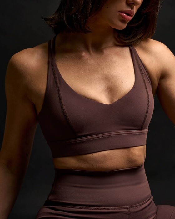 Топ спортивный с рельефными швами по груди, v-образным вырезом и  двойными  завязками -спагетти  переплетенные на спине. Топ с мягкими съемными чашками.