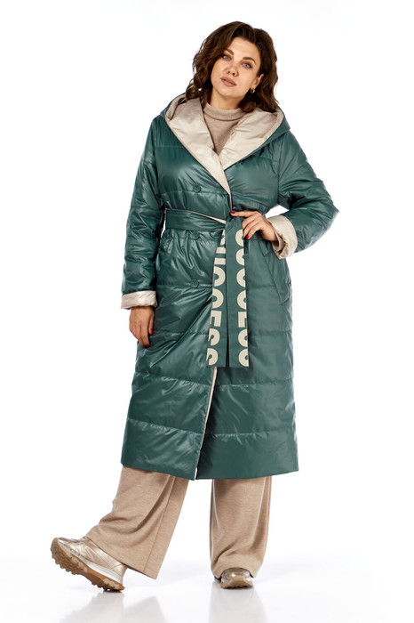 Пальто женское прямого силуэта с двубортной застежкой на 6 пуговиц. Пальто двухстороннее. Светлая сторона выстегана синтепоном. Перед с боковыми прорезными карманами с листочкой на светлой стороне и накладными на темной. Рукава втачной, двухшовный. Воротник-капюшон цельнокроеный с полочкой. Пояс съемный, двухсторонний, по светлой стороне украшен печатью.