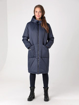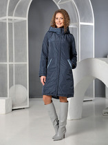 Пальто женское, прямого силуэта со смещенной застежкой на молнию (внутренняя) и кнопки. Линия плеча спущенная, рукав втачной одношовный. По переду карманы с личточкой. По спинке средний шов. Капюшон с центральной частью и отделочной деталью по отлету. В качестве отделки используется фурнитура и детали. Утеплитель- синтепон 150 гр.