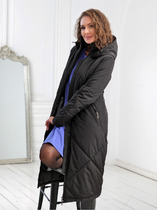Зимнее пальто прямого силуэта с застежкой на двухзамковую молнию, которая позволяет регулировать ширину шага при необходимости. Воротник - уютная стойка, переходящая в капюшон. Комфортности придают удобно расположенные карманы на кнопках. Есть внутренний кармашек на молнии. Длину втачного рукава можно корректировать отворотом. Модель такого пальто средней длины подходит для девушек и женщин разных возрастных категорий. Плащевая ткань, из которой выполнено изделие, имеет водоотталкивающую пропитку, выдерживающую небольшой дождь, снег и ветер. Хорошо зарекомендовавший себя утеплитель "Холлофайбер", плотностью 300г/м, защитит от холода. Подкладка в изделии выполнена из ткани в мелкую полоску.