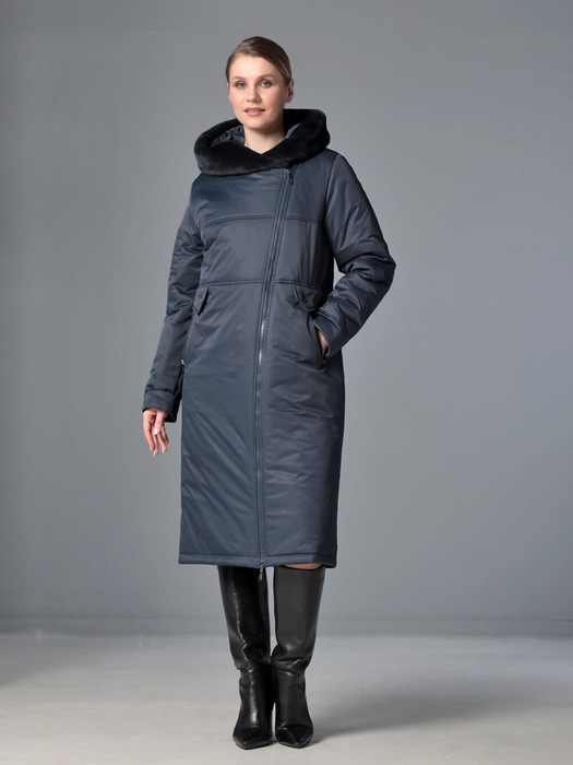 Стильное зимнее пальто средней длины с ассиметричной застежкой на двухзамковую молнию, которая расстегиванием снизу, позволяет регулировать ширину шага при подъеме и ходьбе. Прямой силуэт можно скорректировать затяжкой на талии, увеличив тем самым прилегание по спинке. Капюшон оформлен меховой опушкой, не отстегивается. Модный искусственный мех  хорошо стирается и не меняет свой красивый внешний вид после высыхания. Длину втачного рукава можно регулировать отворотом. Комфортности добавляют удобно расположенные  карманы с молнией. Есть внутренний кармашек, тоже на молнии.  Модель этого пальто рекомендована женщинам и девушкам любой возрастной категории. Оно универсально  - его можно сочетать как с платьями и юбками, так и с джинсами и брюками.  Плащевая ткань имеет водоотталкивающую пропитку,  которая выдержит небольшой  дождь или снег. Хорошо зарекомендовавший себя современный утеплитель Холлофайбер, плотностью 300 г/м, защитит от холода и  ветра. Подкладка в изделии - в мелкую полоску.
