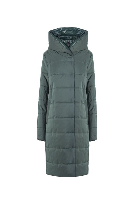 Пальто женское плащевое утепленное прямого силуэта, двубортное, длиной ниже колена, на подкладке. Застежка на пробивные потайные кнопки. Перед c карманами листочка, застегивающимися на потайную кнопку. Рукав длинный, двухшовный. Пальто с капюшоном и «манишкой» с застежкой на молнии, из плащевой ткани, стеганой на утеплителе ISOSOFT 200г.