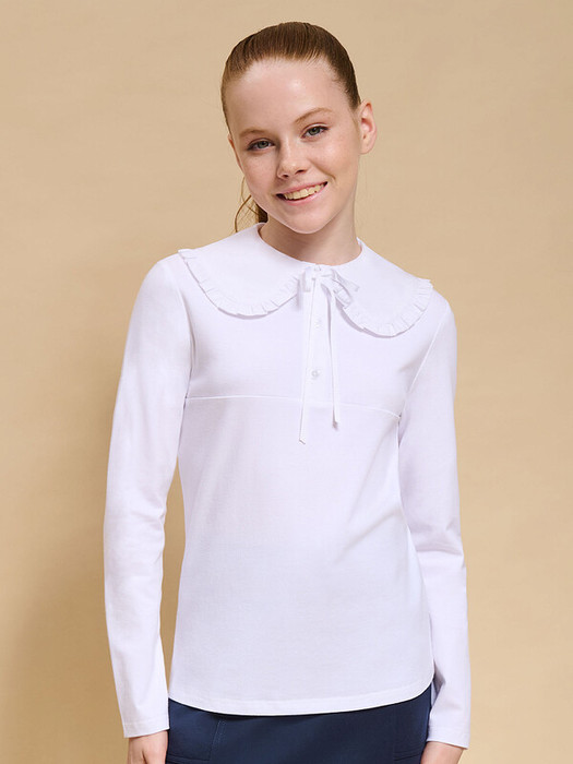 Трикотажная блузка для девочек умеренного объёма, выполнена из эластичного хлопкового материала с длинным рукавом. Новым элементом в блузке является большой плосколежащий воротник фигурной формы, декорированный рюшей по внешнему краю, выполненный из отделочной швейной ткани. Удобство надевания изделия через голову обеспечивается спроектированной спереди планкой из швейного полотна с застежкой на пуговицы. Нижний край планки вшит в кокетку переда. Сзади под воротником пришита узкая декоративная репсовая тесьма, которая завязывается спереди на бантик под воротником.