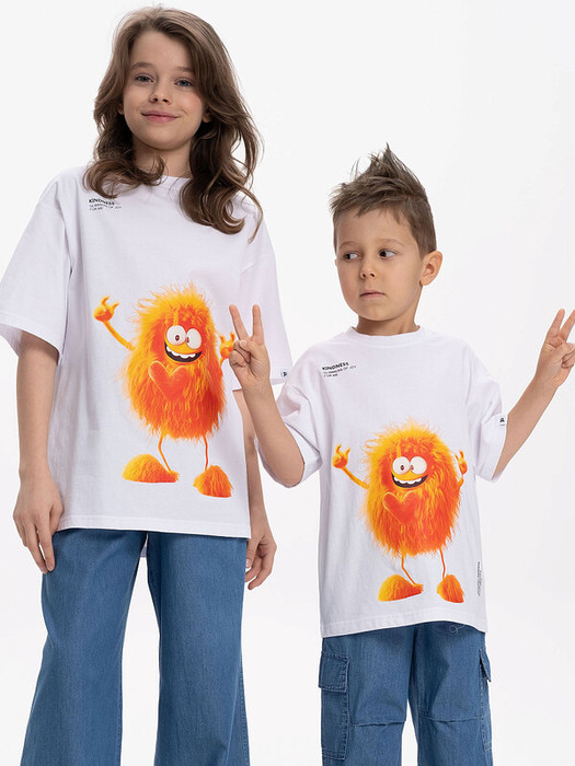 Детская футболка унисекс среднего объема. Прикольная нарядная футболка свободного силуэта со спущенным плечом не будет стеснять движений ребёнка. Вырез горловины отделан эластичной рибаной - голова не застрянет. Главная фишка футболки — яркий милый принт, изображающий персонажа, сгенерированного нейросетью (искусственным интеллектом). Это супермодный тренд! Принт эластичный и стойкий — без проблем переносит многочисленные стирки, не теряя своей яркости. На принте изображён забавный пушистый чудик (монстрик) оранжевого цвета + надписи "доброта", "искры радости для меня" и "создано с помощью искусственного интеллекта". Широкая размерная сетка позволяет приобрести такую футболку как малышу в детский садик так и подростку. . Белые футболки подходят для носки летом, осенью и весной (демисезон), а также зимой .  Цвет товара на экране вашего устройства может отличаться от цвета изделия вживую.