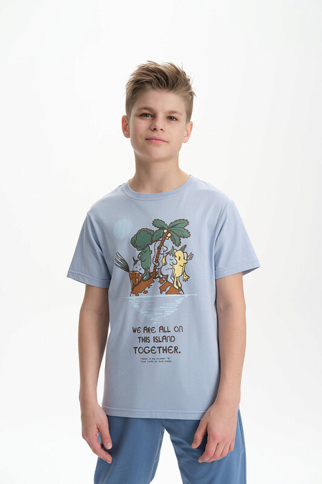 Футболка для мальчика прямого кроя - это идеальный выбор для активного ребенка. Вырез горловины обработан эластичной тканью — она прекрасно держит форму, не растягивается, при этом ребёнку удобно надевать и снимать футболку. Футболка летняя с принтом и надписями. Перевод надписей "we are all on this island together" - мы все на этом острове, "there is  no planet "B". take care of our home" - планеты "Б" нет. Заботься о нашем доме. Спортивная футболка подходит как для подростков так и для малышей в детский сад. Подходит для любого времени года.