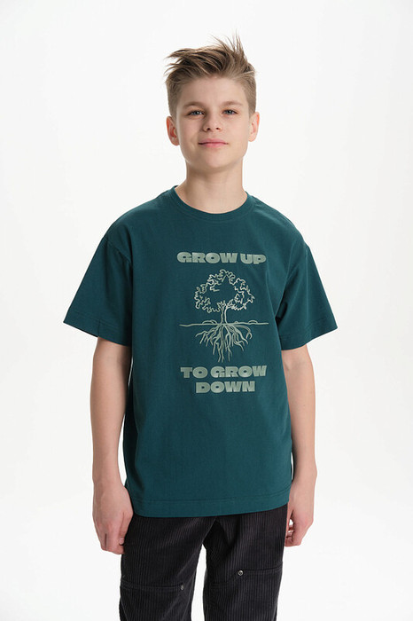 Футболка для мальчика свободного кроя - это идеальный выбор для активного ребенка. Вырез горловины обработан эластичной тканью — она прекрасно держит форму, не растягивается, при этом ребёнку удобно надевать и снимать футболку. Футболка летняя с высоким резиновым принтом и надписями. Перевод надписей "grow up to grow down" - расти вниз ( в смысле пустить корни), чтобы расти вверх. Яркая спортивная футболка подходит как для подростков так и для малышей в детский сад. Подходит для любого времени года.