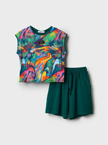Комплект для девочек туника и лосины. Туника А силуэта с мягким спущенным плечом очень свободного силуэта. Асимметричный низ туники подчеркнут красивым воланом. Фольгированный голографический принт с неоном. Лосины из эластичного трикотажа.