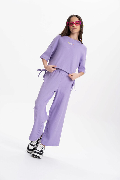 Комплект для девочки (кроп-топ и кюлоты), в котором собраны все самые актуальные тренды. Кроп-топ оверсайз-силуэта с сильно спущенным плечом дополнен утяжками по низу, с помощью которых можно регулировать объём и менять силуэт изделия. Брюки на широкой резинке с внутренней регулировкой объема шнуром. Благодаря особенностям кроя костюм долго будет "расти" вместе с ребенком. Комплект выполнен из трикотажного полотна с модной "вафельной" текстурой. В составе ткани преобладает хлопок, поэтому модель комфортная, приятная на ощупь, в ней не будет жарко летом. Эластан в составе ткани помогает изделию сохранять форму. Ткань проста в уходе. Изюминка топа — лаконичная вышивка в виде трёх цветков. Комплект идеально сядет на девочку любой фигуры, можно покупать без примерки. Костюм для настоящих модниц, в нем каждая девочка будет выглядеть стильно и эффектно.