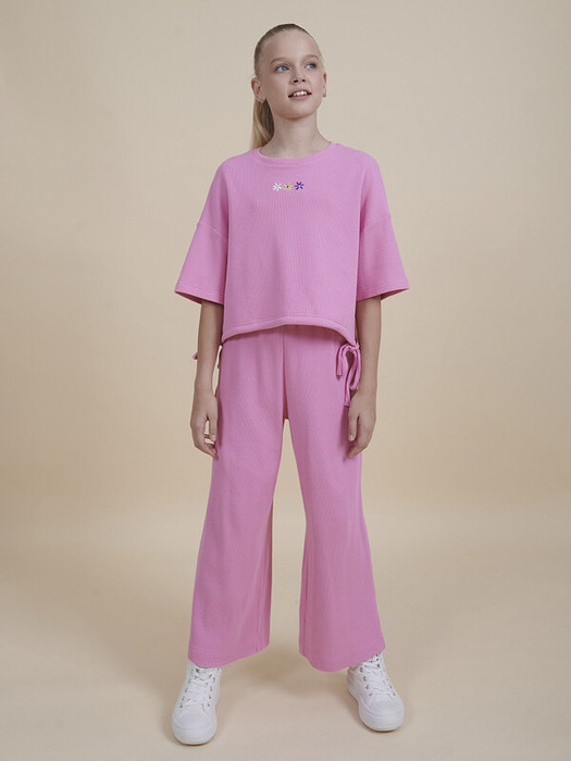 Комплект для девочки (кроп-топ и кюлоты), в котором собраны все самые актуальные тренды. Кроп-топ оверсайз-силуэта с сильно спущенным плечом дополнен утяжками по низу, с помощью которых можно регулировать объём и менять силуэт изделия. Брюки на широкой резинке с внутренней регулировкой объема шнуром. Благодаря особенностям кроя костюм долго будет "расти" вместе с ребенком. Комплект выполнен из трикотажного полотна с модной "вафельной" текстурой. В составе ткани преобладает хлопок, поэтому модель комфортная, приятная на ощупь, в ней не будет жарко летом. Эластан в составе ткани помогает изделию сохранять форму. Ткань проста в уходе. Изюминка топа — лаконичная вышивка в виде трёх цветков. Комплект идеально сядет на девочку любой фигуры, можно покупать без примерки. Костюм для настоящих модниц, в нем каждая девочка будет выглядеть стильно и эффектно.