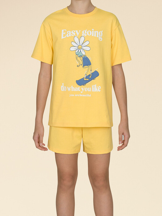 Стильная и уютная пижама актуального жёлтого цвета для девочки. В составе ткани 100% хлопка — идеально для детской одежды! Модель приятна на ощупь, прекрасно пропускает воздух, позволяя коже ребёнка дышать. При этом в пижаме из хлопка ребёнку будет уютно, даже если он сбросит одеяло. Всё это обеспечивает комфортный и качественный сон. Свободная футболка и комфортные шорты, плечо немного спущено, рукава широкие — в пижаме очень удобно спать. Широкая и мягкая резинка в поясе не перекручивается и не давит. Отделка горловины из эластичной рибаны — она не растягивается, ребёнку удобно надевать и снимать пижаму. Шорты однотонные, жёлтого цвета. Футболку украшает позитивный принт в виде ромашки на скейтборде. Надписи переводятся: "лёгкая на подъём", "делай то, что тебе нравится", "ты прекрасна". В линейке представлены детские пижамы следующих размеров: 2 (92); 3 (98); 4 (104); 5 (110); 6 (116), 7 (122); 8 (128); 9 (134); 10 (140); 11 (146). Хлопковый комплект идеален для сна и отдыха дома — прекрасный выбор для вашего ребёнка! Пижама с шортами для девочки подходит для круглогодичного использования. Домашний комплект — замечательный подарок дочке, внучке, сестре на любой праздник. Выбирайте нужный размер по таблице размеров на фото. Цвет товара на экране вашего устройства может отличаться от цвета изделия вживую.