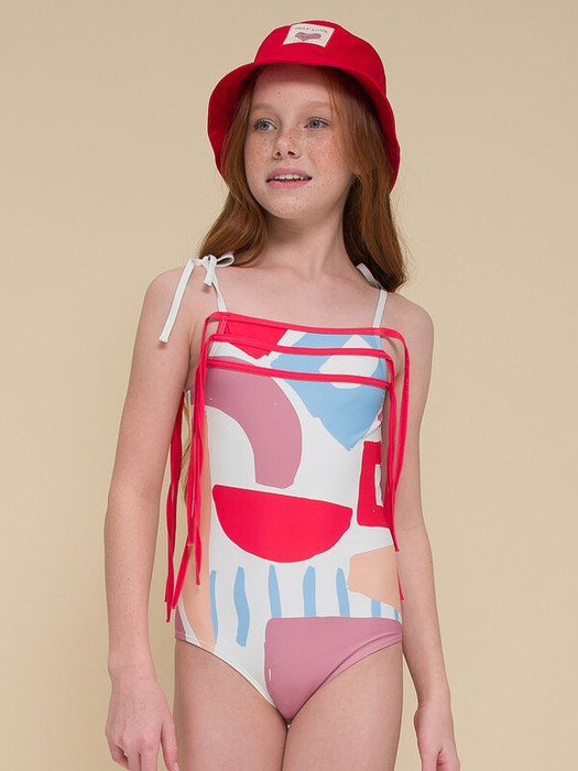 Купальник слитный для девочки. Мягкая эластичная ткань разработана специально для купальных костюмов и идеально садится по фигуре.  Быстро сохнет и практически нет выгорания на солнце. Тонкие завязывающие бретели позволяют регулировать купальник по росту девочки. Разноцветный принт колорблок и яркие завязки из пайпинга - настроение лета, теплого ветерка и солнца.
