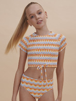 Оригинальный и стильный раздельный купальник для девочки. Топ — укороченная футболка с рукавами кроя реглан и округлым вырезом горловины. Весть топ собран параллельными эластичными строчками — актуально и по-девичьи красиво. По переду небольшой декоративный бантик. Трусы классические высокой посадки, аккуратные и комфортные. Детский купальник выполнен из полиамида и эластана — он прекрасно тянется, не теряя при этом своей формы, не выгорает и быстро сохнет. Трусы однотонные, жёлтого цвета. Топ в разноцветную фигурную полоску. В линейке представлены детские купальники следующих размеров: 3 (98); 4-5 (104-110); 6-7 (116-122); 8-9 (128-134); 10-11 (140-146). Купальник красивый подходит для девочек дошкольного, младшего школьного возраста и девочек-подростков. Идеальный вариант для летнего отдыха, пляжа, моря и бассейна. Топ можно носить отдельно — с юбками или шортами, велосипедками. Модный купальник — замечательный подарок дочери, внучке или сестре на любой праздник. Выбирайте нужный размер по таблице размеров на фото. Цвет товара на экране вашего устройства может отличаться от цвета изделия вживую. Товар возврату и обмену не подлежит.