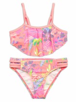 Раздельный купальник для девочек. Верх симметричный топ без регулировки объема, по переду большой волан. Лямки с регулировкой по длине. Перед продублирован подкладкой. Низ трусы с увеличенной высотой посадки. Декор боковые вставки с тремя параллельными полосками. Перед продублирован подкладкой.