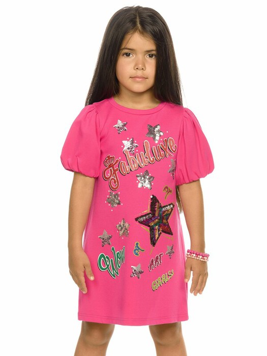 Платье А силуэта с круглым вырезом горловины. Особенностью платья является ультрамодный рукав баллон с мягким подвёрнутым низом и подкладом из трикотажа. Перед декорирован принтом с разноцветными глиттером и металликом, аппликации в виде звёзд из пайеток. Перевод  игра слов Fabulous Luxe  Потрясающий Раскошный . Вау. Искусство. Девчонки.
