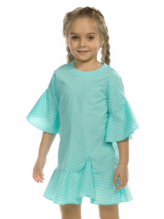 Платье для девочек. НОВИНКА! Платье нового силуэта с притачным воланом по низу переда, спинки и рукавов из ткани в горошек. На спинке центральный шов и аккуратный разрез у горловины с потайной пуговкой. Необычный фигурный способ притачивания волана спереди сбоку и на рукаве создает интересные фалды.