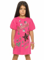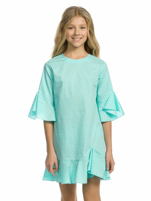 Платье для девочек. НОВИНКА! Платье нового силуэта с притачным воланом по низу переда, спинки и рукавов из ткани в горошек. На спинке центральный шов и аккуратный разрез у горловины с потайной пуговкой. Необычный фигурный способ притачивания волана спереди сбоку и на рукаве создает интересные фалды.