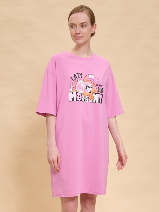 Платье футболка женское оверсайз. Трикотажное платье оверсайз прямого кроя с коротким широким рукавом. Плечо спущено — модель максимально комфортная. Комфортное платье-футболка с принтом – базовый элемент женского гардероба. Повседневное платье свободного кроя подойдет для любой фигуры. В составе ткани изделия преобладает высококачественный хлопок – платье мягкое и отлично пропускает воздух, позволяя коже дышать. Эластан помогает модели надолго сохранить первоначальную форму. Модель украшена милым, «няшным» принтом в виде собачки корги, надпись переводится: «ленивый момент с моей собакой». Принт эластичный и мягкий, великолепно переносит многочисленные стирки. Просторное платье в спортивном стиле подходит как женщинам, так и девушкам, девочкам-подросткам. Свободное платье оверсайз идеально для носки дома, комфортного сна, пижамной вечеринки, отдыха. Платье майка подходит для повседневного летнего гардероба, прогулок, отдыха, пляжа. А также модель удобна для беременных. Помните о правильном уходе за изделием: рекомендуется стирать при температуре не выше 30 °C, без предварительного замачивания, с изнанки. Это поможет сохранить качество и цвет платья на длительное время.