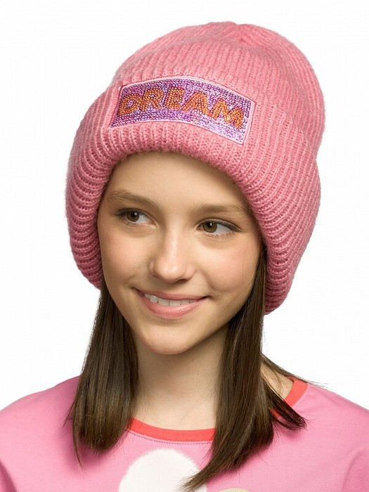 Шапка для девочек на подкладе из флиса из новой пушистой пряжи с двойным отворотом. По переде декоративная нашивка из пайеток надпись Мечта.