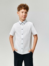 Школьная рубашка для мальчика из практичной ткани с современными деталями. Самые уязвимые для грязи детали выполнены из ткани контрастного цвета. Это разбавляет официальный стиль и позволяет не стирать белую рубашку каждый день.