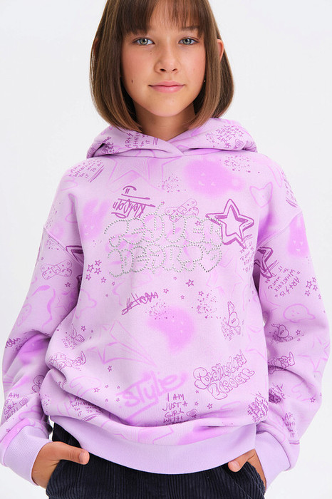 Модное худи для девочки из тонкого футера с мягким начесом — лёгкое и тёплое, идеально для прохладных дней. Модель умеренного объёма удобно сидит и не сковывает движений.