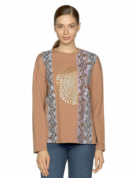 Толстовка женская из тонкого мягкого футера! Прямой свободный силуэт, спущенная линия плеча, актуальная горловина и слегка удлинённый рукав. Небольшой перепад длин между спинкой и передом, разрезы 16 см. в боковых швах. Устойчивый и мягкий принт сочетает в себе мотивы рисунка питона и шрифтовую композицию, выполненную золотым металликом. Перевод Следуй за своим сердцем.