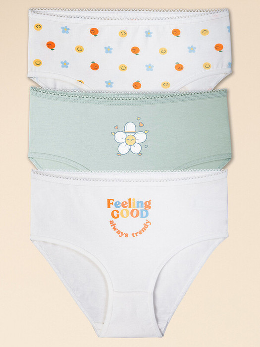 При выборе белья для своего ребёнка каждая мама хочет быть уверена в его качестве и в том, что ребёнку будет комфортно. Комплект трусов для девочки (3 шт.) полностью соответствует этим требованиям. Слипы высокой посадки выполнены из ткани с высоким содержанием хлопка — модель мягкая, прекрасно пропускает воздух, давая коже ребёнка дышать. Благодаря эластану в составе изделие надолго сохраняет отличную форму, даже после многочисленных стирок. Качественная ткань и анатомически правильный крой обеспечивают идеальную посадку на теле — ребёнку комфортно на протяжении всего дня. Мягкая резинка исключает раздражение и трение. Трусы детские для девочки представлены в трёх актуальных вариантах расцветки: белые со сплошным принтом в виде цветочков, смайликов и улыбающихся мандаринов, зелёные с принтом в виде улыбающейся ромашки и белые с позитивным принтом-надписью, надпись переводится: "хорошее настроение всегда в тренде". Принты эластичные и стойкие, отлично переносят частые стирки. В линейке представлены хлопковые трусы следующих размеров: 1 (86); 2 (92); 3 (98); 4 (104); 5 (110); 6 (116); 7 (122); 8 (128); 9 (134); 10 (140); 11 (146). Модель подходит девочкам дошкольного возраста, девочкам младшего школьного возраста и девочкам-подросткам. Трусы слипы для девочки — идеальный выбор детского белья для повседневной носки. Модные трусы станут хорошим подарком дочери или внучке на любой праздник. Выбирайте нужный размер по таблице размеров на фото. Цвет товара на экране вашего устройства может отличаться от цвета изделия вживую. Товар возврату и обмену не подлежит.