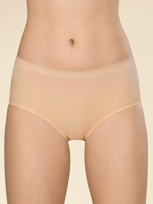 Женские трусы-шорты со средней посадкой. Изготовлены по бесшовной технологии с минимум швов. Кромки по ноге и по талии подогнуты и приклеены, хлопковая приклеенная ластовица.  Нежное геометричное кружево по линии талии высотой 5 см – не передавливает тело и не натирает кожу.  Модель оценят те, кто ищет незаметное и невесомое белье на каждый день или особого случая.