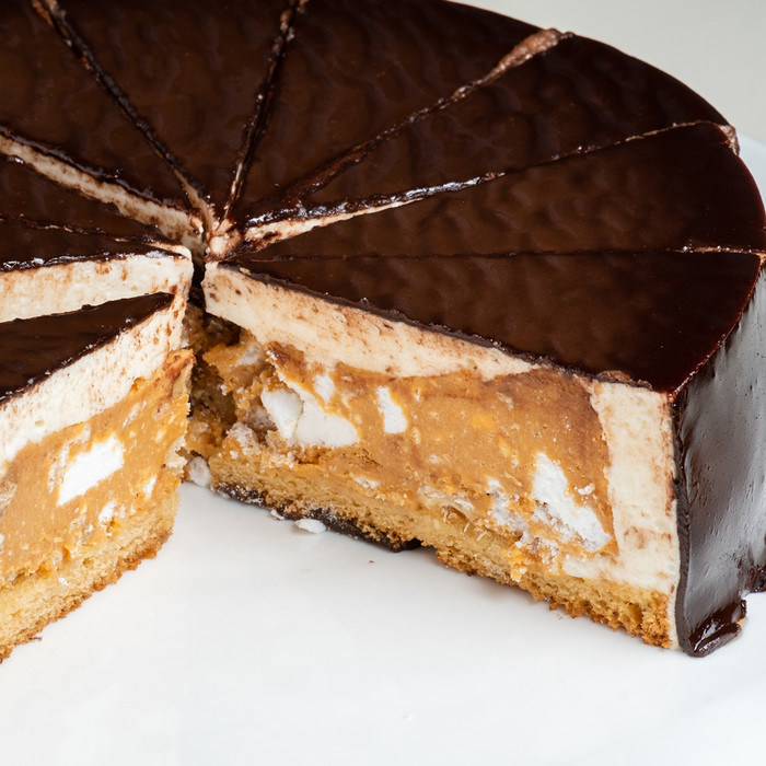 Состав продукта: cахарный песок, масло сливочное 82%, варёное сгущёное молоко, печенье сахарное (мука пшеничная, масло растительное, сахар сироп инвертный (сахар, регуляторы кислотности: кислота молочная, натрий двууглекислый), крахмал кукурузный, меланж яичный сухой, соль поваренная пищевая, разрыхлители: соль углеаммонийная, натрий двууглекислый (сода пищевая) сыворотка молочная сухая, эмульгатор - соевый лецитин Е322(i), ароматизатор идентичный натуральному "Топлёное молоко", молоко коровье топлёное), шоколадная паста (сахар, растительное масло (пальма), шоколад 23% (какао, сахар), фундук, молочный порошок, эмульгатор: соевый лецитин, ароматизаторы), вода питьевая, сметана 30%, мука пшеничная в\с, грецкий орех, яичный меланж, смесь для безе (сахар-песок, белок яичный сухой, загуститель Е466, соль поваренная пищевая, регулятор кислотности Е330), сода пищевая, агар, уксус 9%, ванилин.