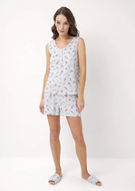 Женская пижама с шортами выполнена из кулирки 100% хлопок. Шорты с притачным поясом на резинке. Футболка полуприлегающего силуэта с декоративной печатью, рукав короткий. Горловина обработана окантовкой.