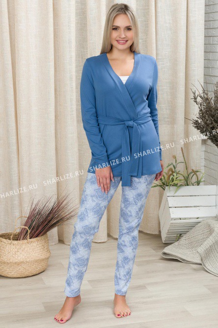 Элегантная модель домашнего женского костюма для дома и отдыха, состоит из кардигана на запах и брюк.Изделие идеально садится по фигуре, а благодаря хлопковой ткани костюм приятен к телу и не сковывает движений.Отличный вариант на каждый день!