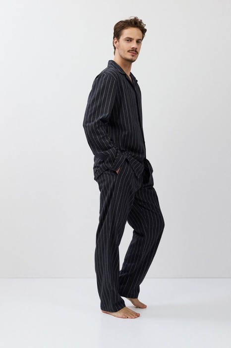 Пижама мужская со штанами CALEB для вашего ночного комфорта. Пижама выполнена из хлопковой фланели. Рубашка на пуговицах, с длинными рукавами, отложным воротником. Штаны длинные, свободной формы, с эластичным поясом с завязкой и боковыми карманами. Расслабьтесь с максимальным комфортом и стилем в пижаме CALEB.