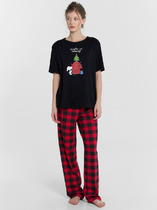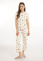 Пижама женская из вискозного трикотажного полотна с набивным рисунком, состоящая из футболки и брюк. Футболка – прямая, с короткими втачными рукавами. Полочка с V – образными кружевными деталями по горловине.Брюки - свободного покроя с эластичной тесьмой по талии.