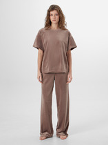 Пижама женская из трикотажного вискозного полотна с набивным рисунком, с отделкой кружевом, состоящая из майки и шорт. Майка - слегка расширенная книзу, с кружевной вставкой-кокеткой V-образной формы и небольшой драпировкой в центре груди.Шорты – удлиненные, с эластичной тесьмой по талии.