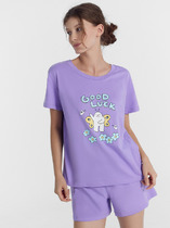 "Костюм-пижама для беременных и кормящих женщин. Футболка с V-образной горловиной, короткими рукавами, со сборкой на резинку спереди, под грудью. Шорты с уменьшенной высотой спереди для их комфортного расположения под животом, расширенные книзу.
