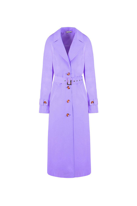 Плащ женский, однобортный, длиной ниже колена, на подкладке. Застежка на петли и пуговицы. Карман листочка. По среднему шву спинки шлица. Рукав реглан длинный, двухшовный с пристегивающейся на петлю и пуговицу патой. Воротник и лацкана отложные. В комплекте съемный пояс с пряжкой и люверсами.