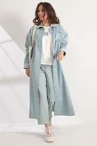 Стильных и универсальный предмет гардероба - джинсовый плащ (тренч) свободного кроя, без подкладки, с центральной застежкой на металлические пуговицы. Выполнен из качественного джинсового полотна. Плащ дополнен съемным поясом, выполненным из основной ткани, а так же удобными боковыми карманами. Рукав спущен. Длина плаща от плечевого шва 125 см Длина рукава 61 см