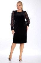 Однотонное платье из велюра. Длинные рукава, общая длина до коленей, треугольный вырез на груди. Размеры от 42 до 52. Имеется возможность заказать товар по розничной цене.