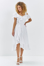 Изделие с широкими бретелями, которые дополнены рюшей.