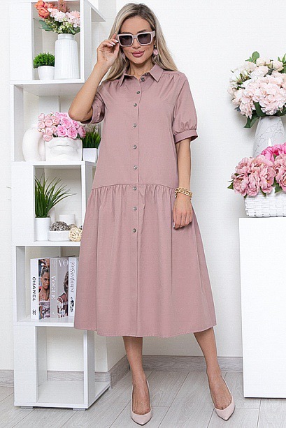 Платье миди свободного силуэта из текстильного полотна с хлопком с центральной застежкой на петли и пуговицы.