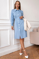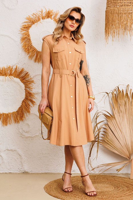 Стильное платье, выполнено в плательной ткани с добавлением хлопка и вискозы. Платье по переду с застежкой на пуговицы, горловина платья с воротником стойкой. Платье декорировано накладными нагрудными карманами с клапаном и пришивной пуговицей, в боковых швах функциональные карманы. Верх платья по фигуре, юбка платья с расклешением. Спереди платья по низу две шлицы. Пояс платья съемный, выполнен из основной ткани с застежкой на полукольца.