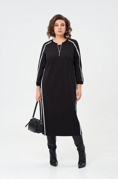 Стильное и комфортное платье из трикотажного полотна идеально подойдёт как для повседневных образов, так и для работы в офисе. Платье с контрастными кантами по рукаву реглан и по переду изделия. Вырез горловины фигурный с декоративной молнией. По переду карманы в швах. Спинка без особенностей.