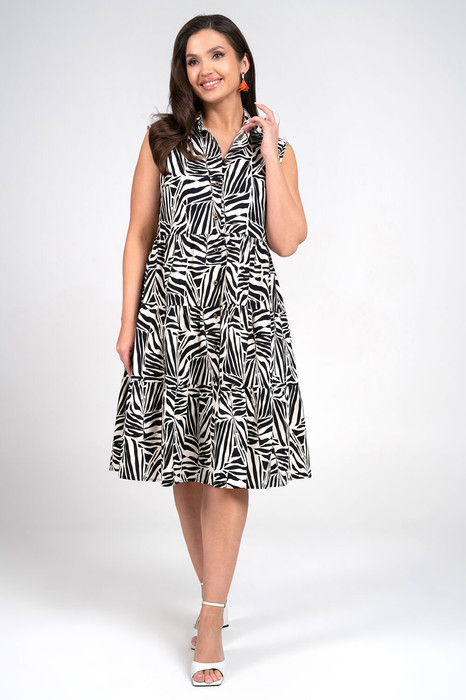 Платье верхняя часть полуприлегающего силуэта, нижняя из трёх воланов собранных на сборку, с застёжкой по плаке на петли, пуговицы, чуть спущенное плечо. Перед с нагрудными выточками. Спинка с талевыми выточками. Воротник стояще-отложной на отрезной стойке застёгивающийся на петлю, пуговицу.