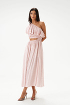 Платье полуприлегающего силуэта вверху с расширением книзу, с цельнокроеной стойкой, с втачными, одношовными, длинными рукавами  книзу расширенные. Горловина, низ изделия и рукава обработаны узкой краеобмёточной строчкой «флешь».